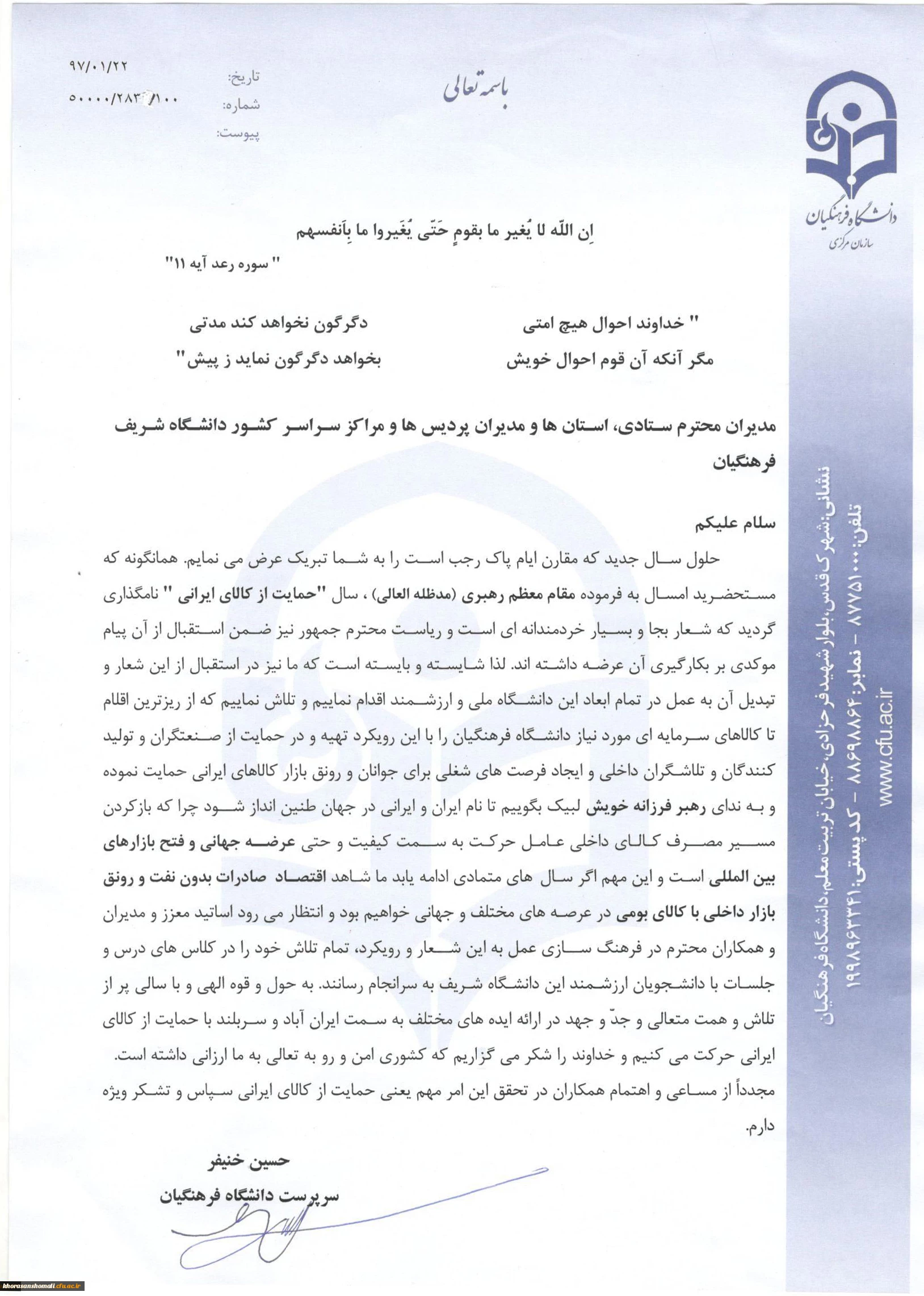 دکتر خنیفر در نامه ای خطاب به مدیران دانشگاه فرهنگیان تاکید کرد: در استقبال از شعار سال، تبدیل آن به عمل در تمام ابعاد دانشگاه ملی و ارزشمند فرهنگیان 2