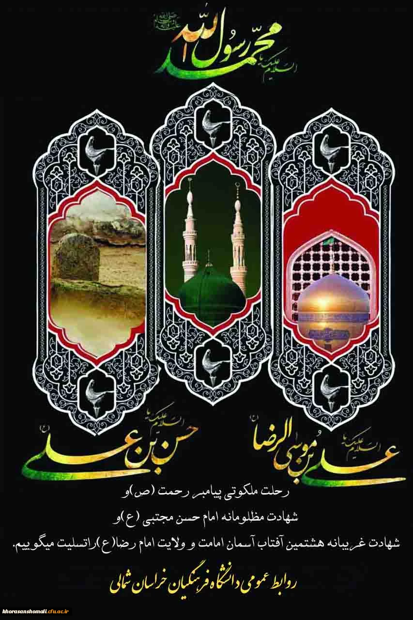 سالروز رحلت پیامبر اکرم(ص) و شهادت امام حسن مجتبی(ع) و شهادت هشتمین آفتاب آسمان ولایت امام رضا(ع) تسلیت باد. 2