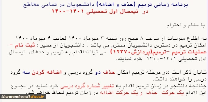 برنامه زمانی ترمیم (حذف و اضافه ) دانشجویان در تمامی مقاطع در نمیسال تحصیلی 1401-1400 2