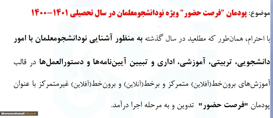 امتیاز دهید : پودمان فرصت حضور ویِژه نو دانشجو معلمان ورودی 1401-1400 2 سهشنبه 4 آبان 1400 ساعت 9:23