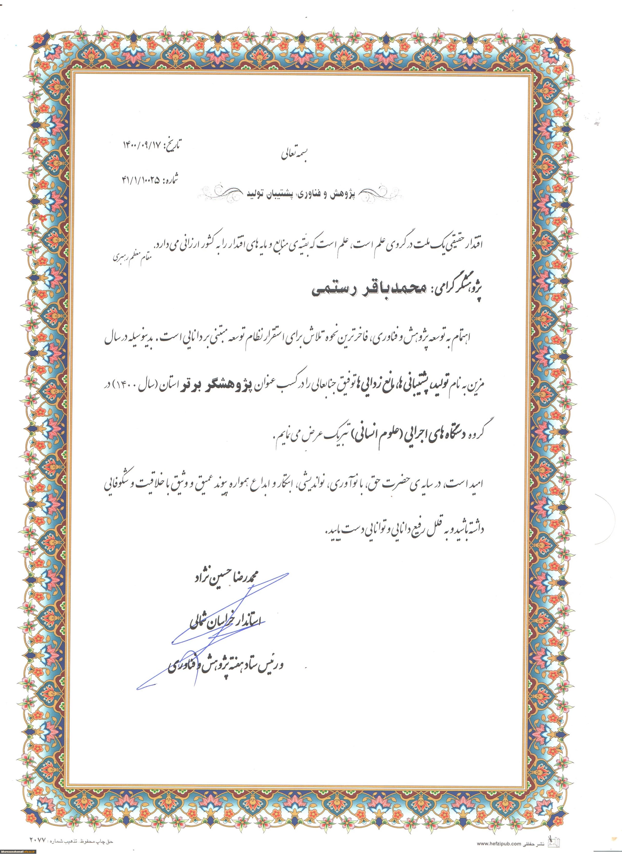 تبریک به همکار محترم جناب آقای دکتر محمد باقر رستمی بعنوان پژوهشگر برتر استانی در سال 1400 4