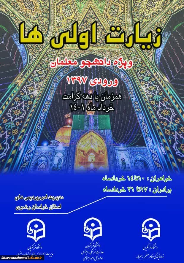 امتیاز دهید : اعزام دانشجو معلمان زیارت اولی پردیس خواهران به شهر مشهد الرضا 5 سهشنبه 17 خرداد 1401 ساعت 6:52