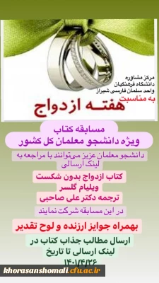 "ازدواج بدون شکست" به مناسبت هفته ازدواج، مرکز مشاوره دانشگاه فرهنگیان واحد سلمان فارسی شیراز در نظر دارد مسابقهی کتاب ...